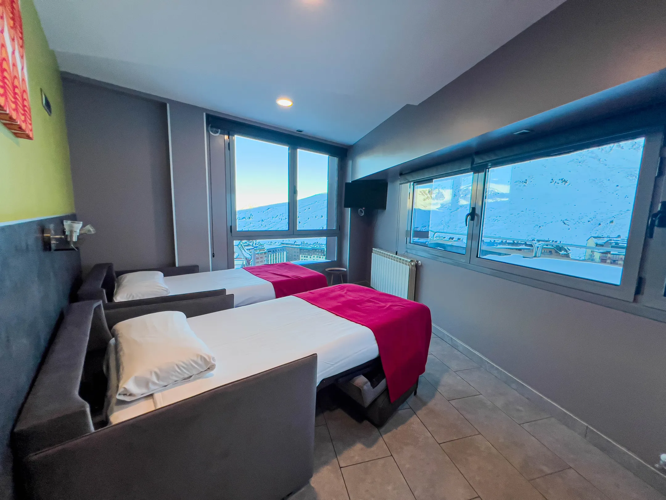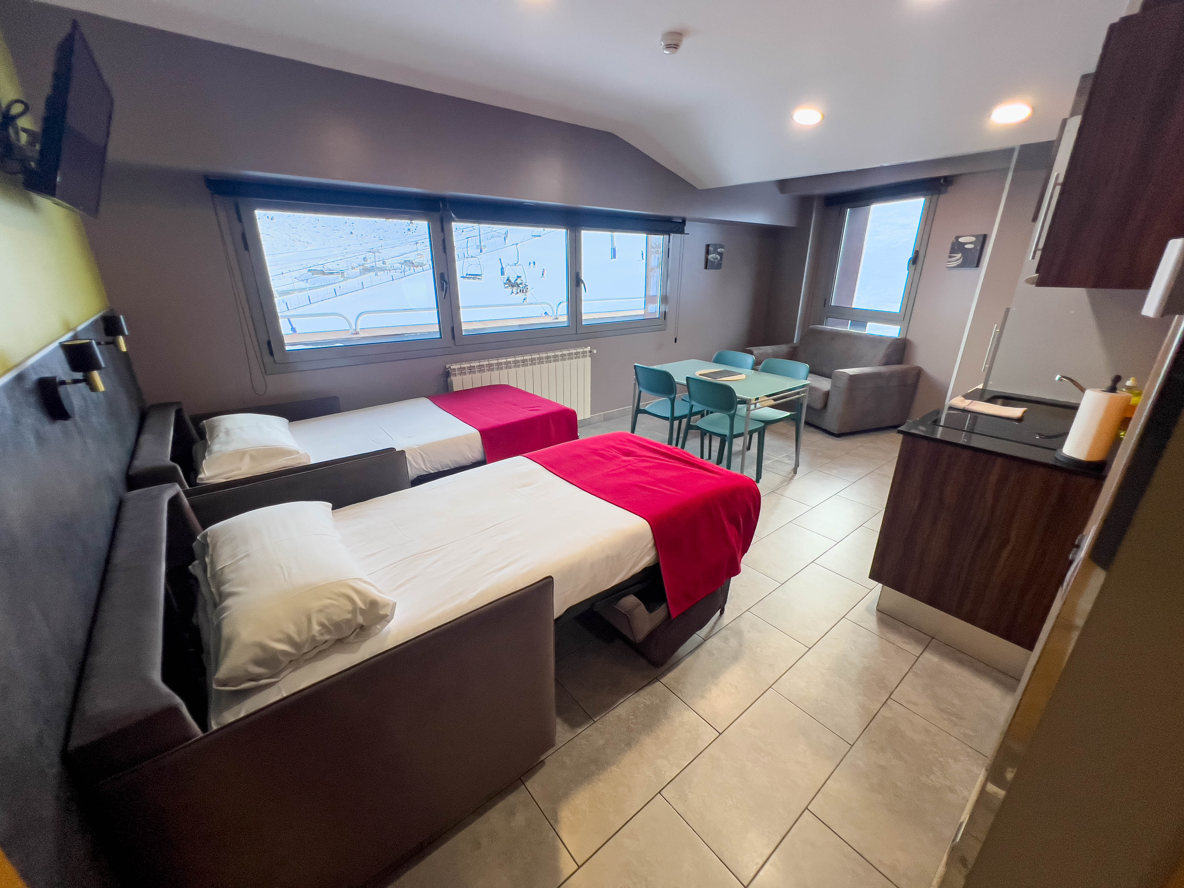 Dispone apartamentos con 1 habitación de 2 a 4 pers, la mayoría con vista frente a pistas. Equipados de una cocina americana (TV plana, nevera, vitroceramica 2 zonas, micro-ondas, tostador, tetera, exprimidor, cafetera, secador de pelo). Servicio diario de limpieza excepto cocina, camas hechas, recogida de basura, limpieza de salida incluida excepto cocina.